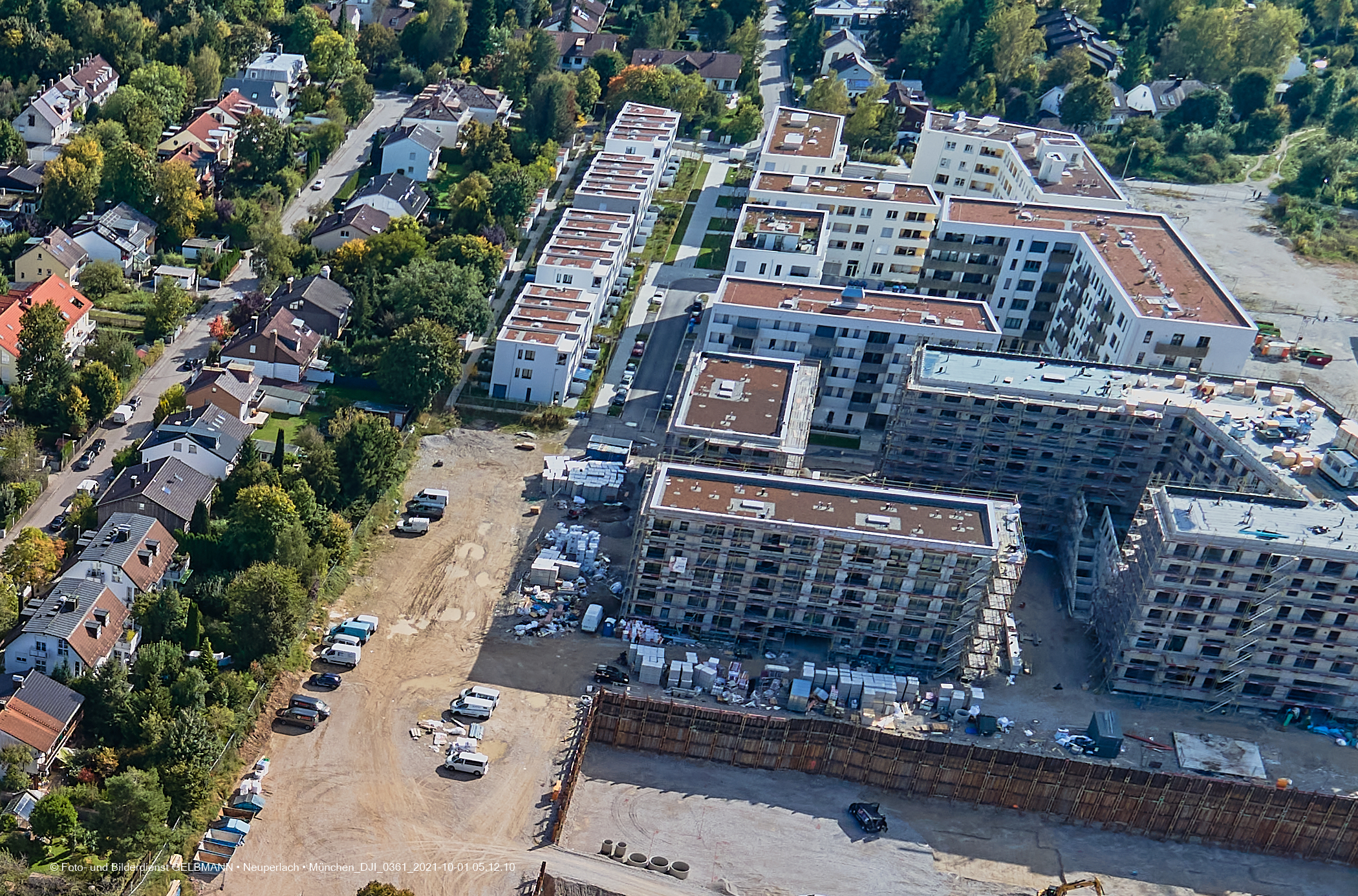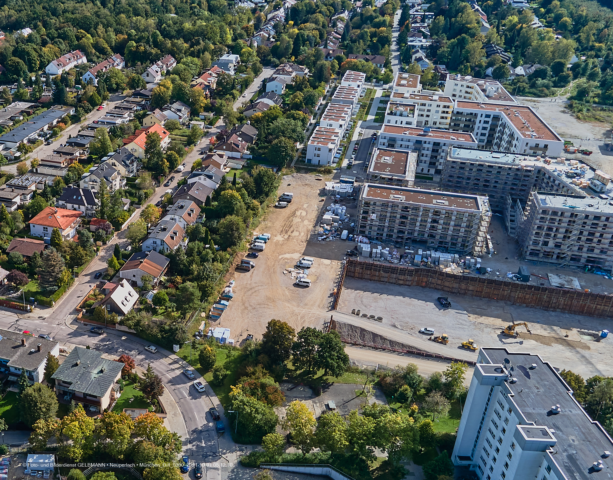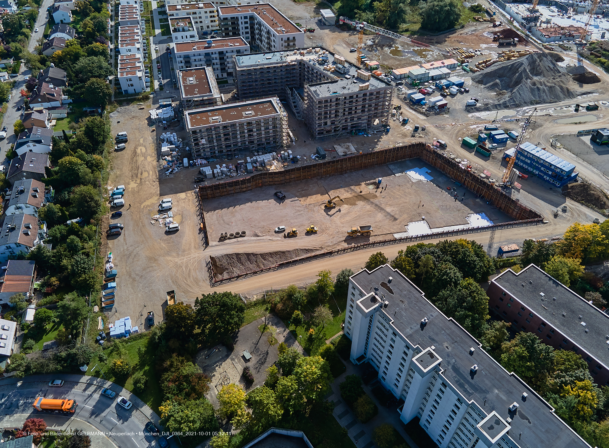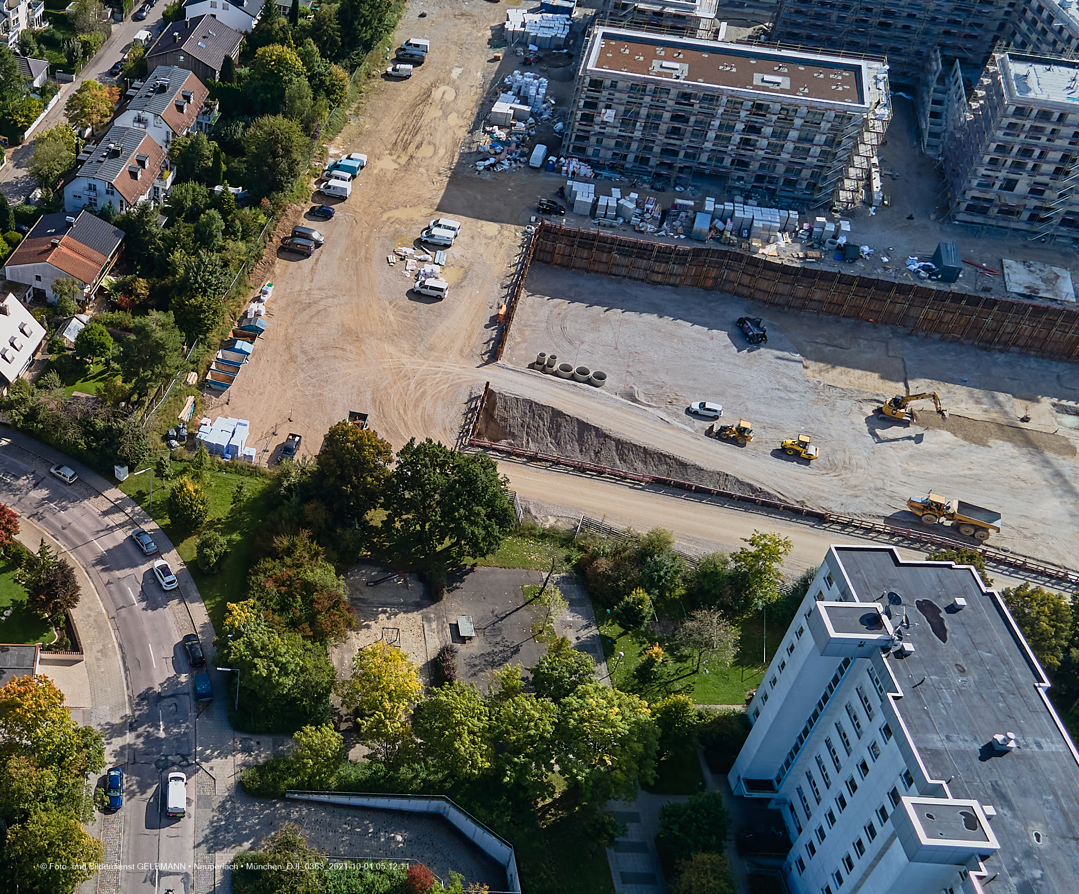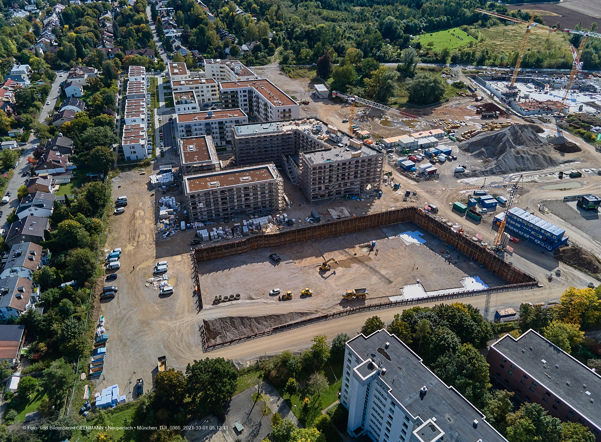 Die DEMOS-Baustelle und BayernHeim-Baustelle Alexisquartier in Neuperlach. Ein kleiner Kran wurde an der Baugrube zur Wohneinheit „Das Duett”, errichtet. Die Baugrube zur Wohneinheit „Das Duett” wartet immer noch auf den Startschuss, um die Bodenplatte zu gießen. Weitere Dacharbeiten finden am Block „Wohnen an der Allee” statt. Die Rohbauten sind fast abgeschlossen.