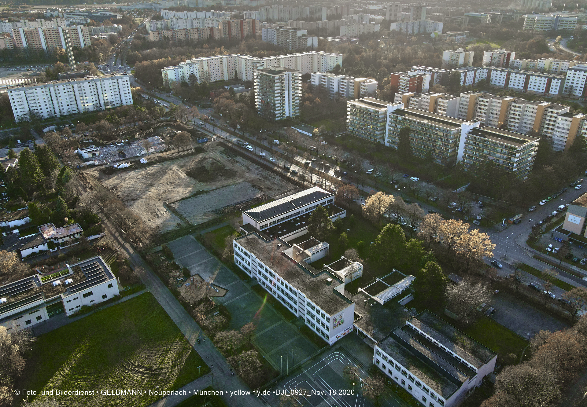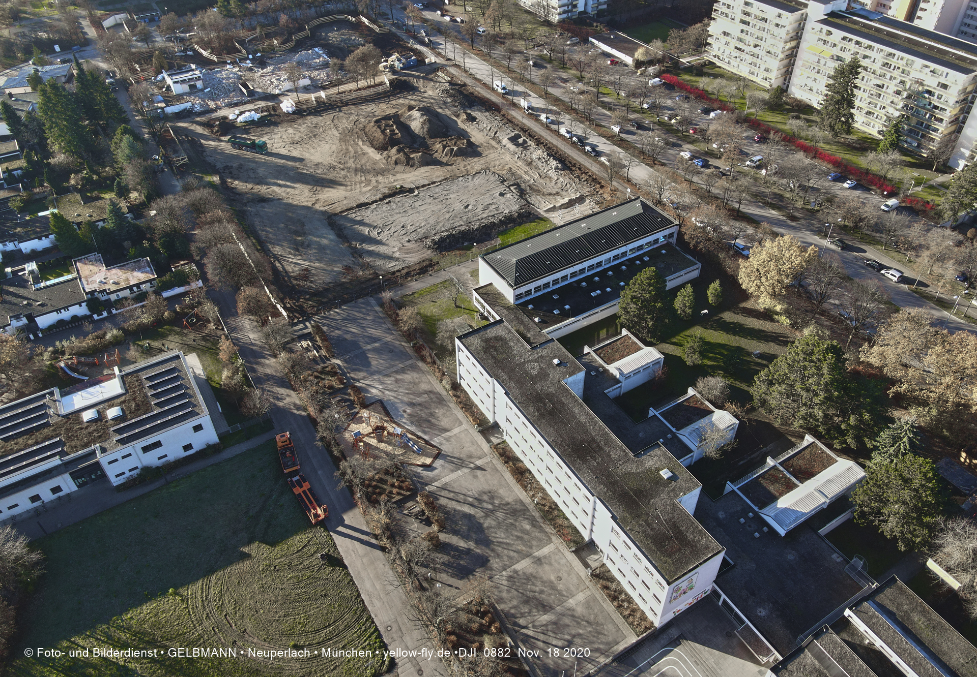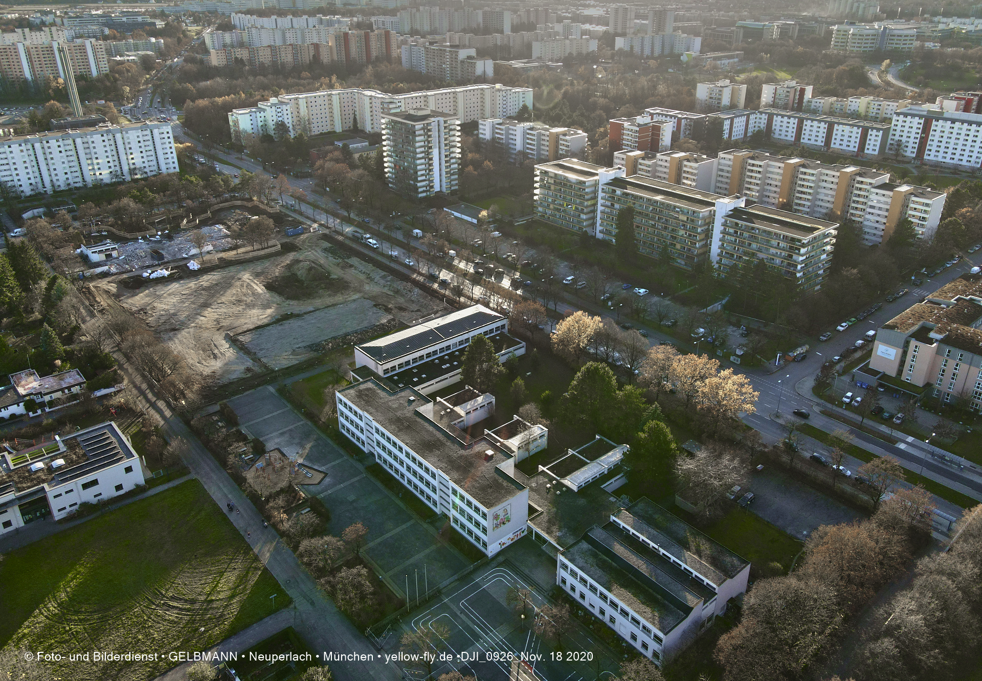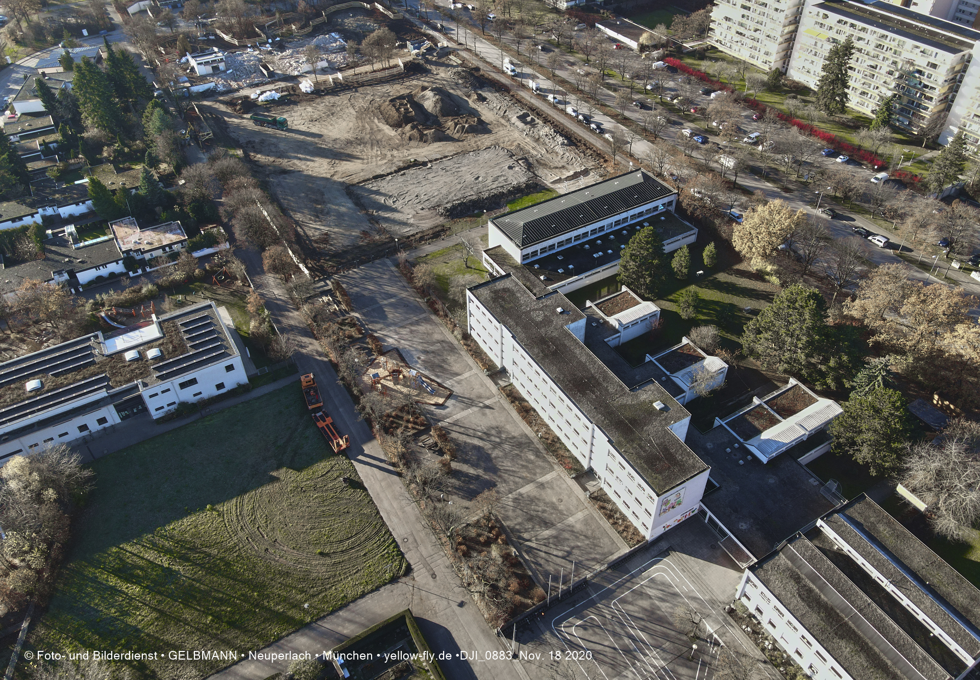 Aktuelle Luftbilder von der Baustelle zur Grundschule am Karl-Marx-Ring in Neuperlach. Immer wenigen Gerüstteile sind an dem Klinkerbau zu sehen.