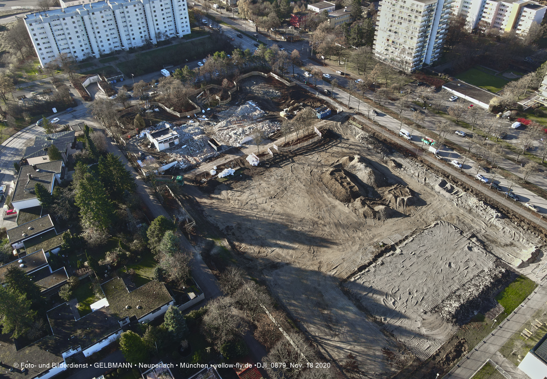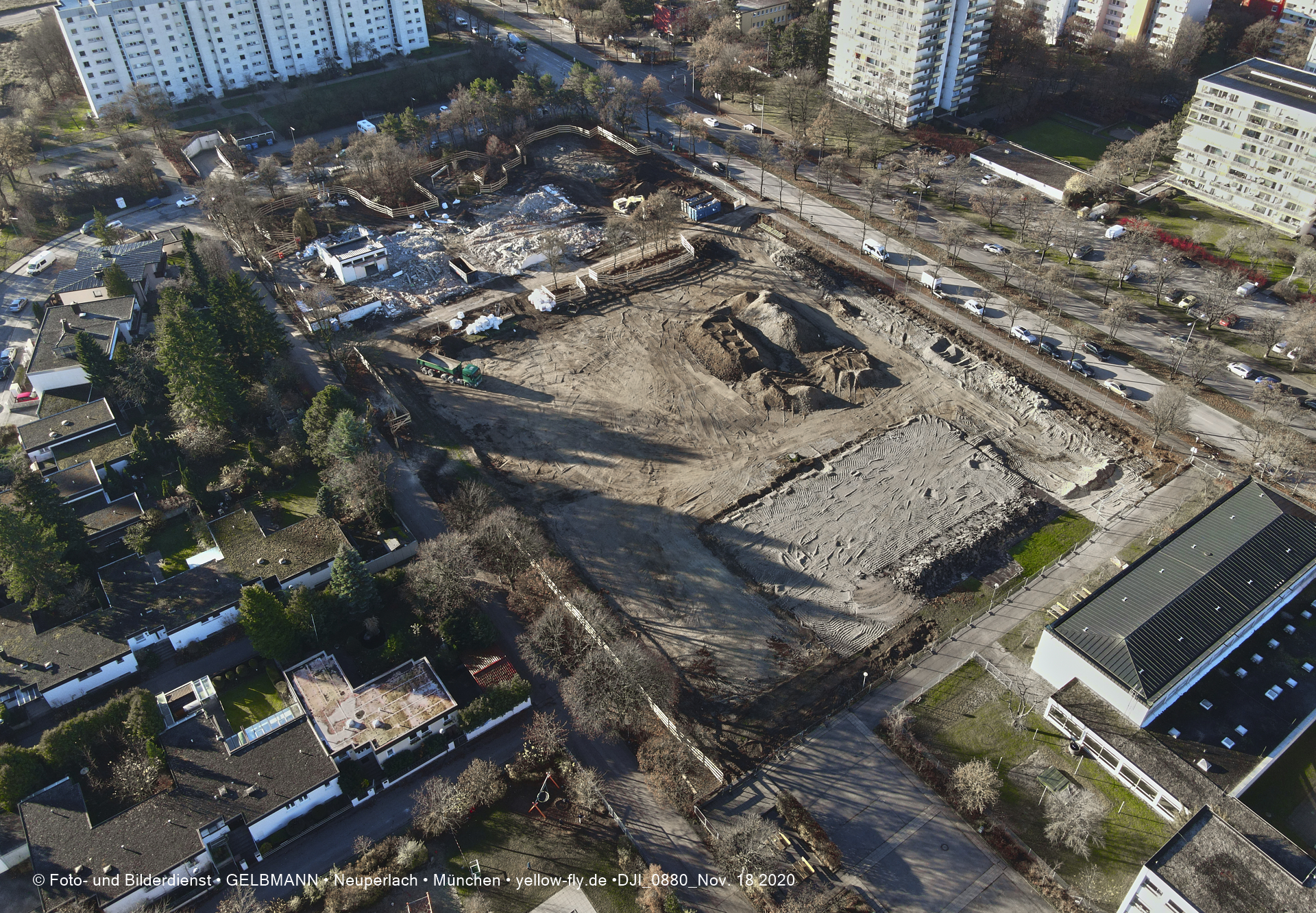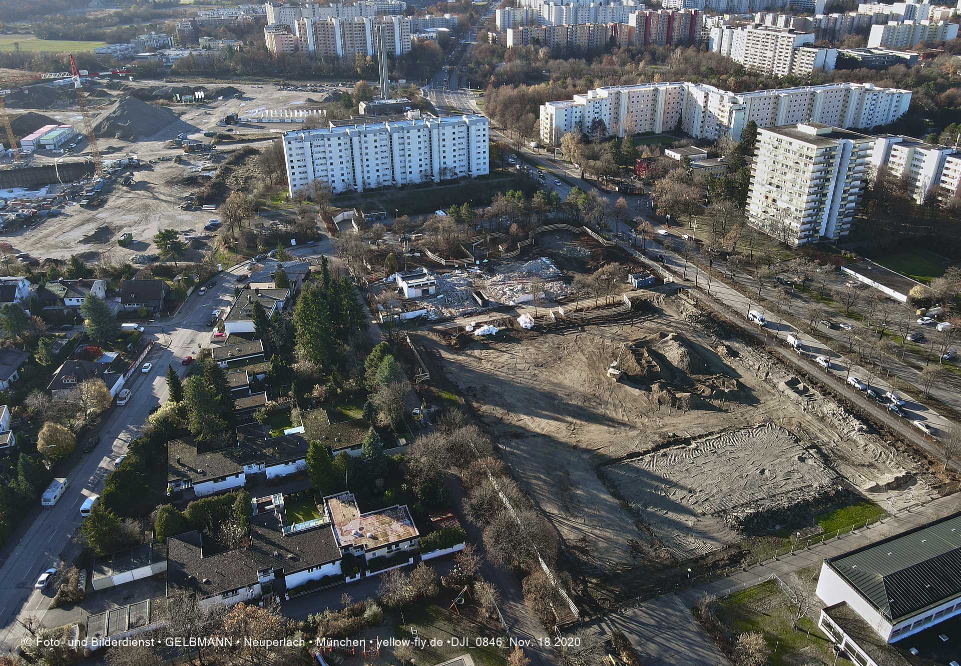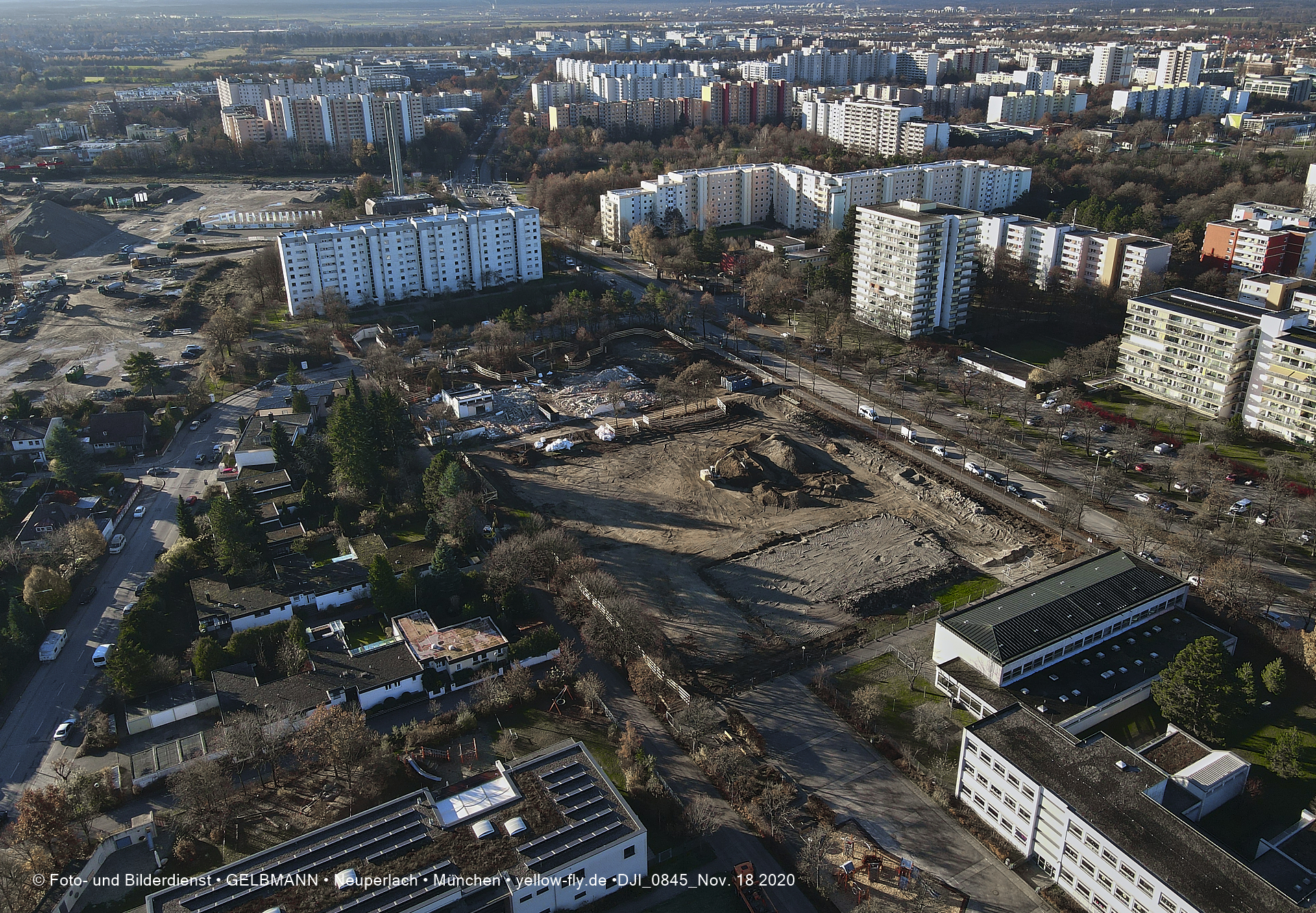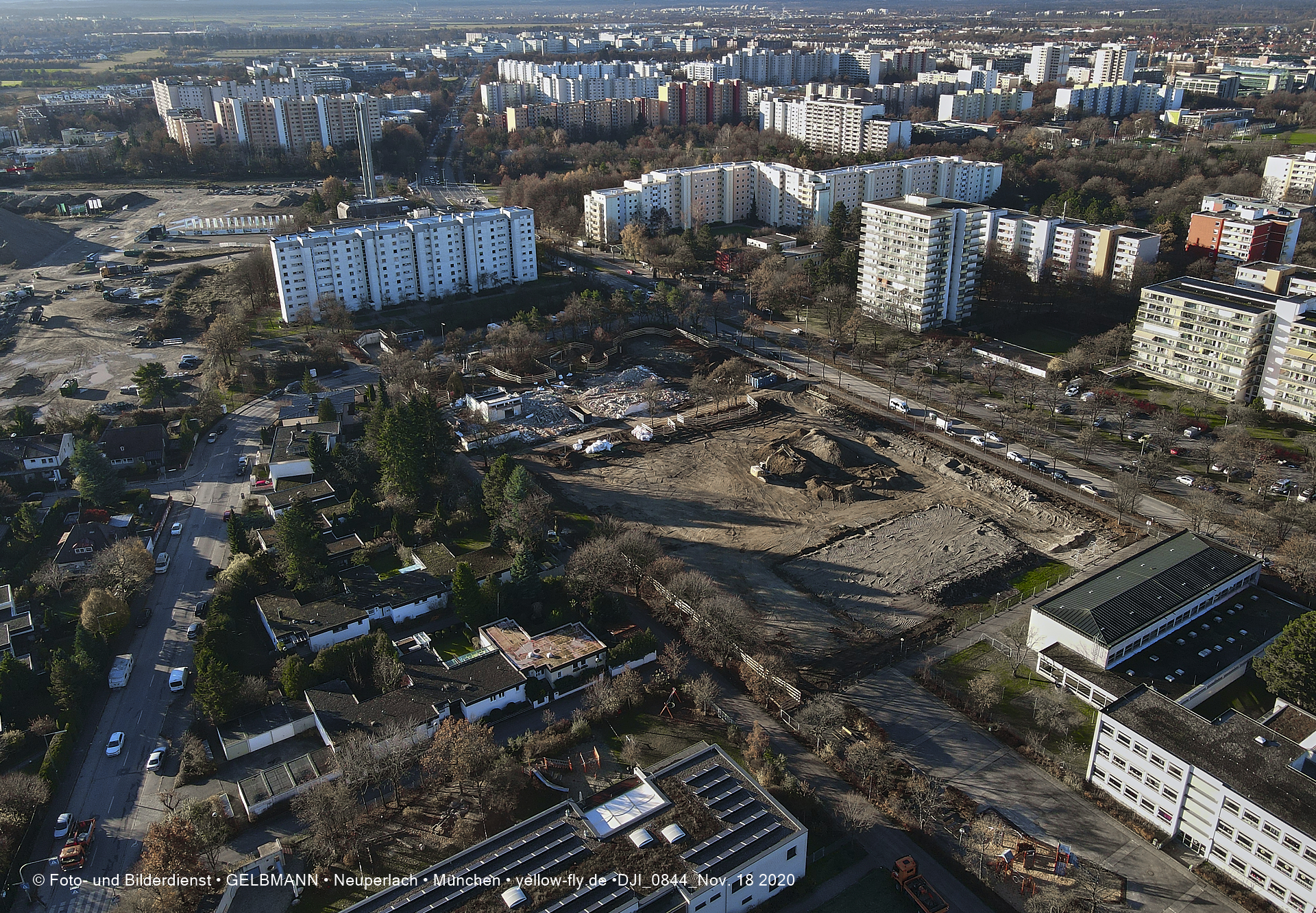 Aktuelle Luftbilder von der Baustelle zur Grundschule am Karl-Marx-Ring in Neuperlach. Immer wenigen Gerüstteile sind an dem Klinkerbau zu sehen.