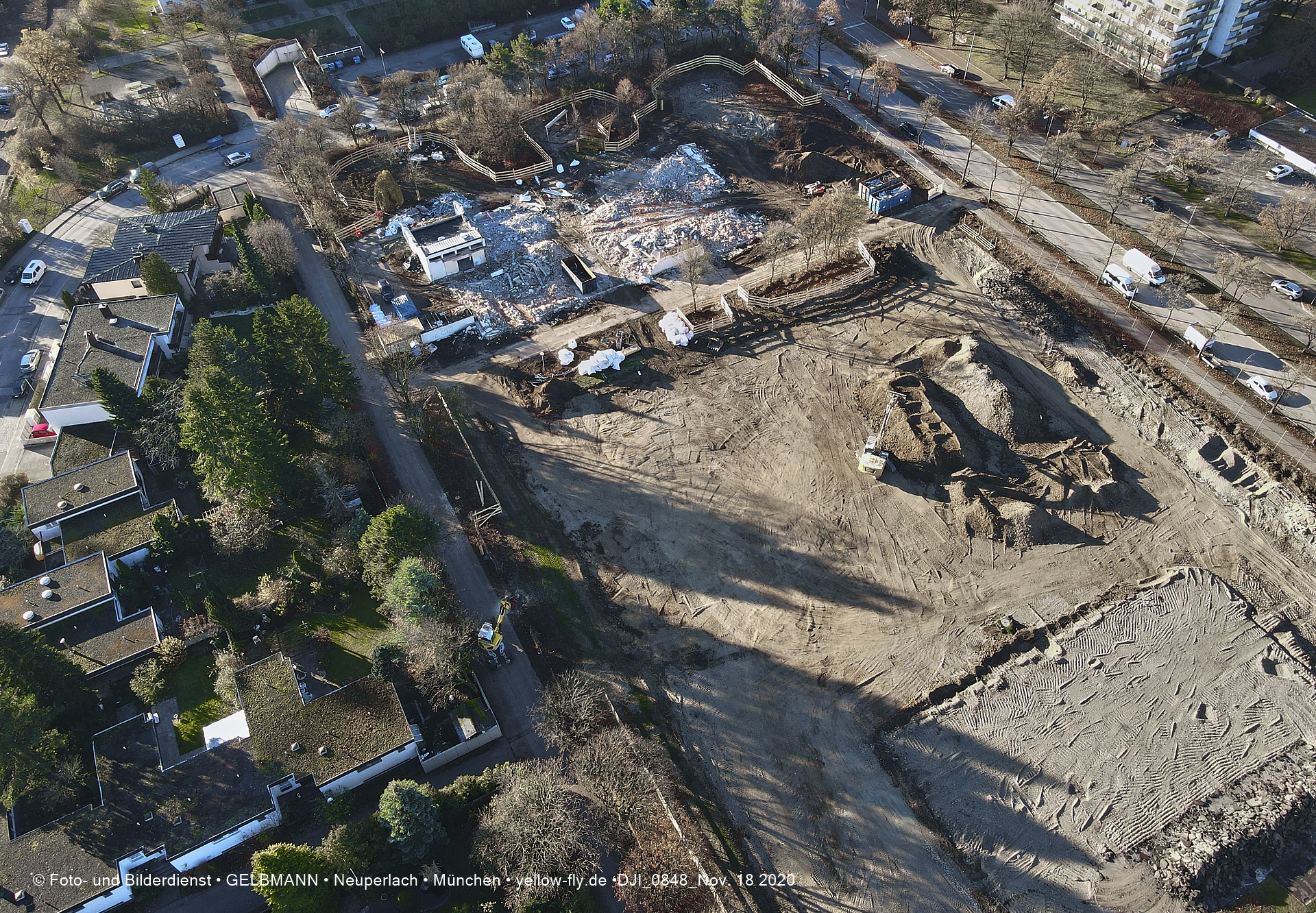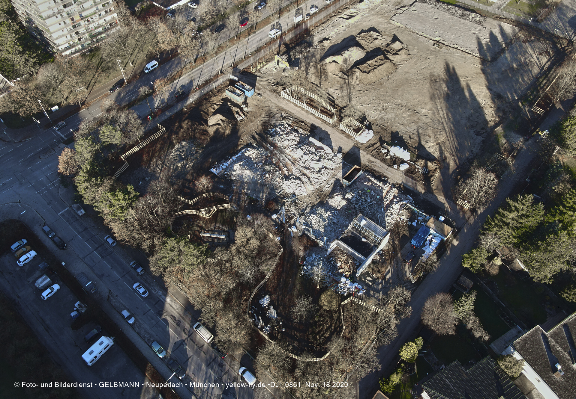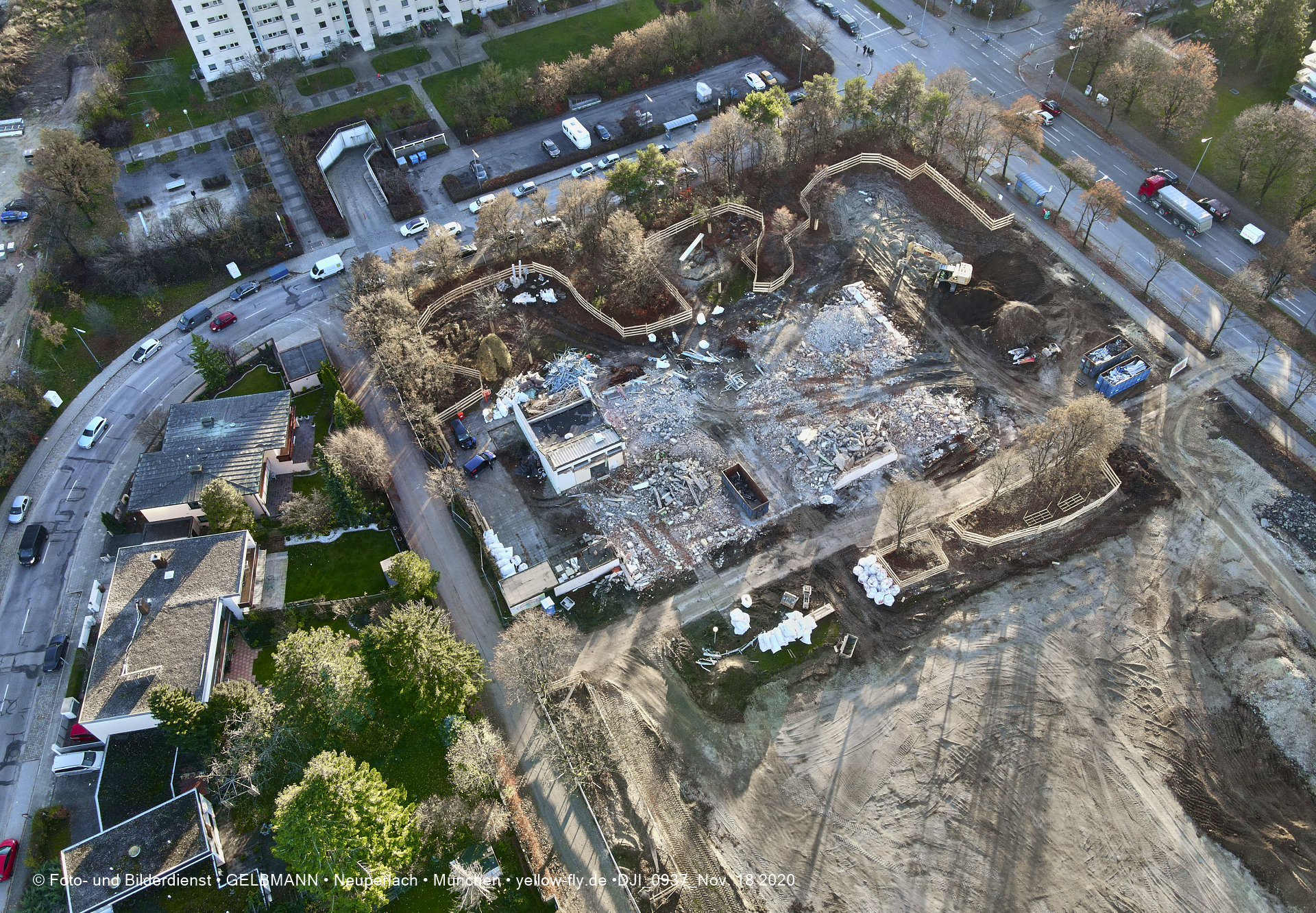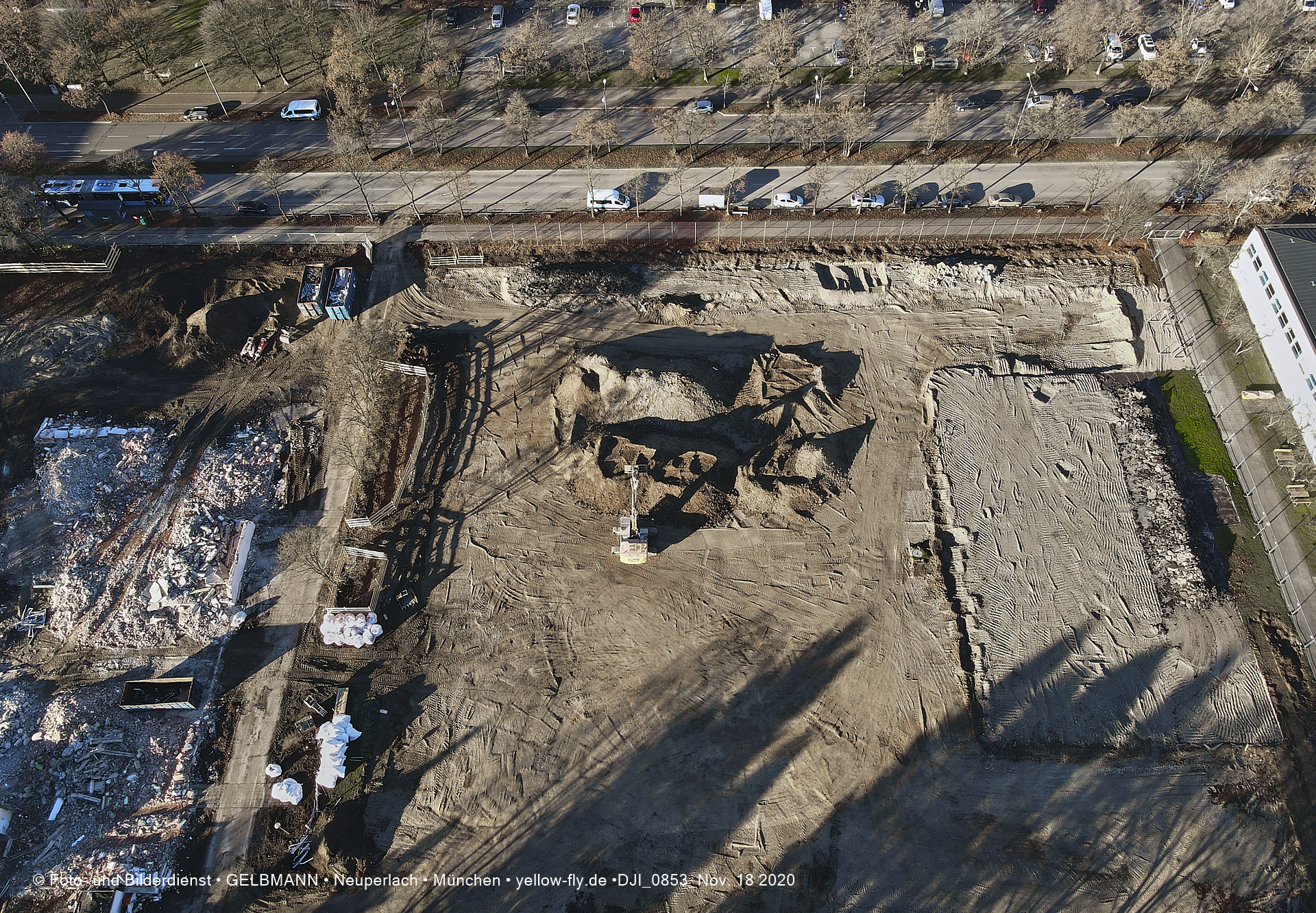 Aktuelle Luftbilder von der Baustelle zur Grundschule am Karl-Marx-Ring in Neuperlach. Immer wenigen Gerüstteile sind an dem Klinkerbau zu sehen.