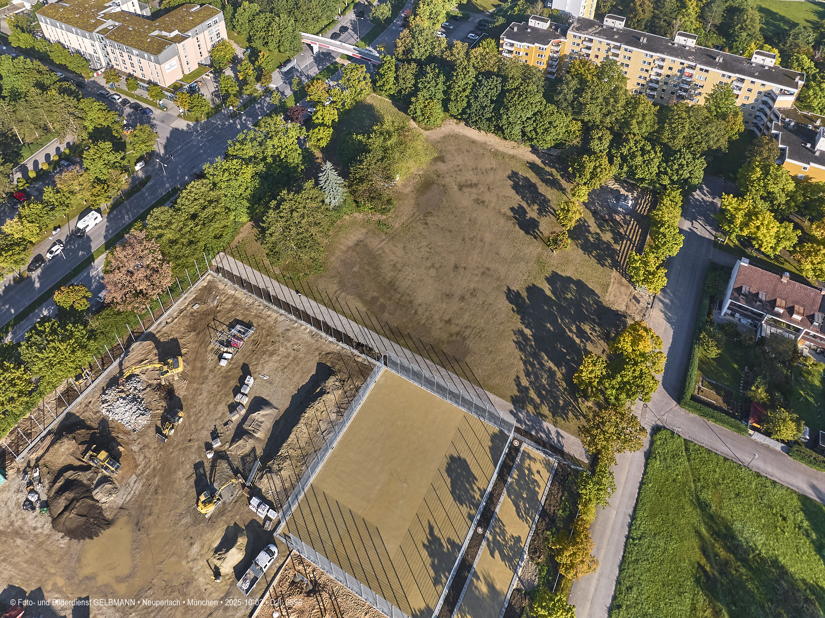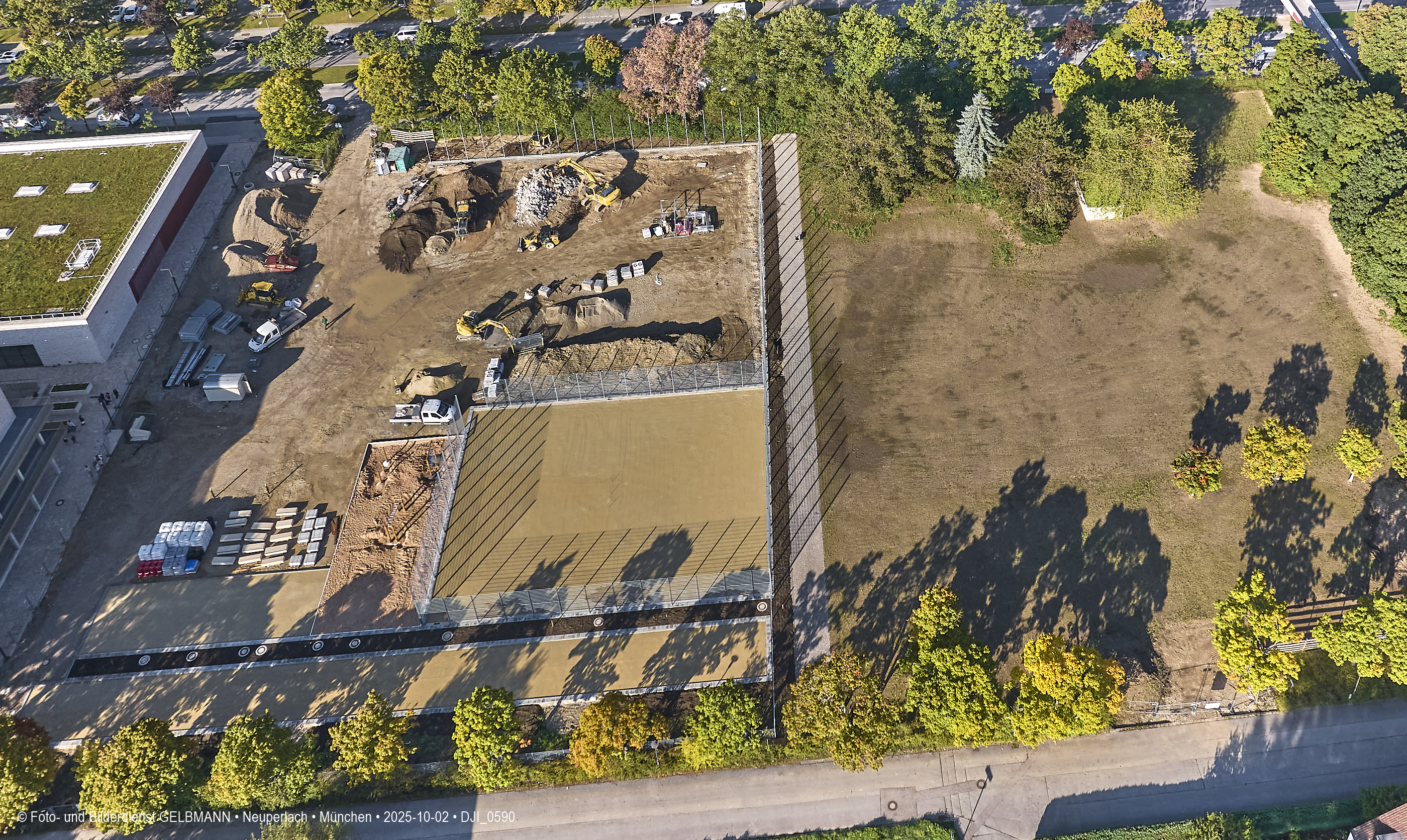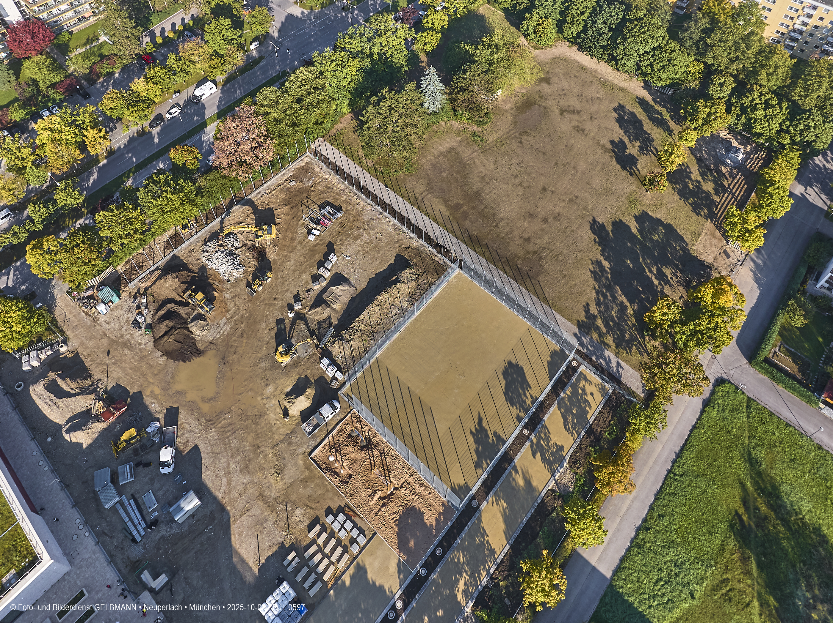 Ein kleiner Teil des neuen Sportplatzes bekommt einen Zaun. Aus der Luft ist dies gut zu sehen. Es sind verschiedene Sport-Areal für diverse Sportarten zu sehen.