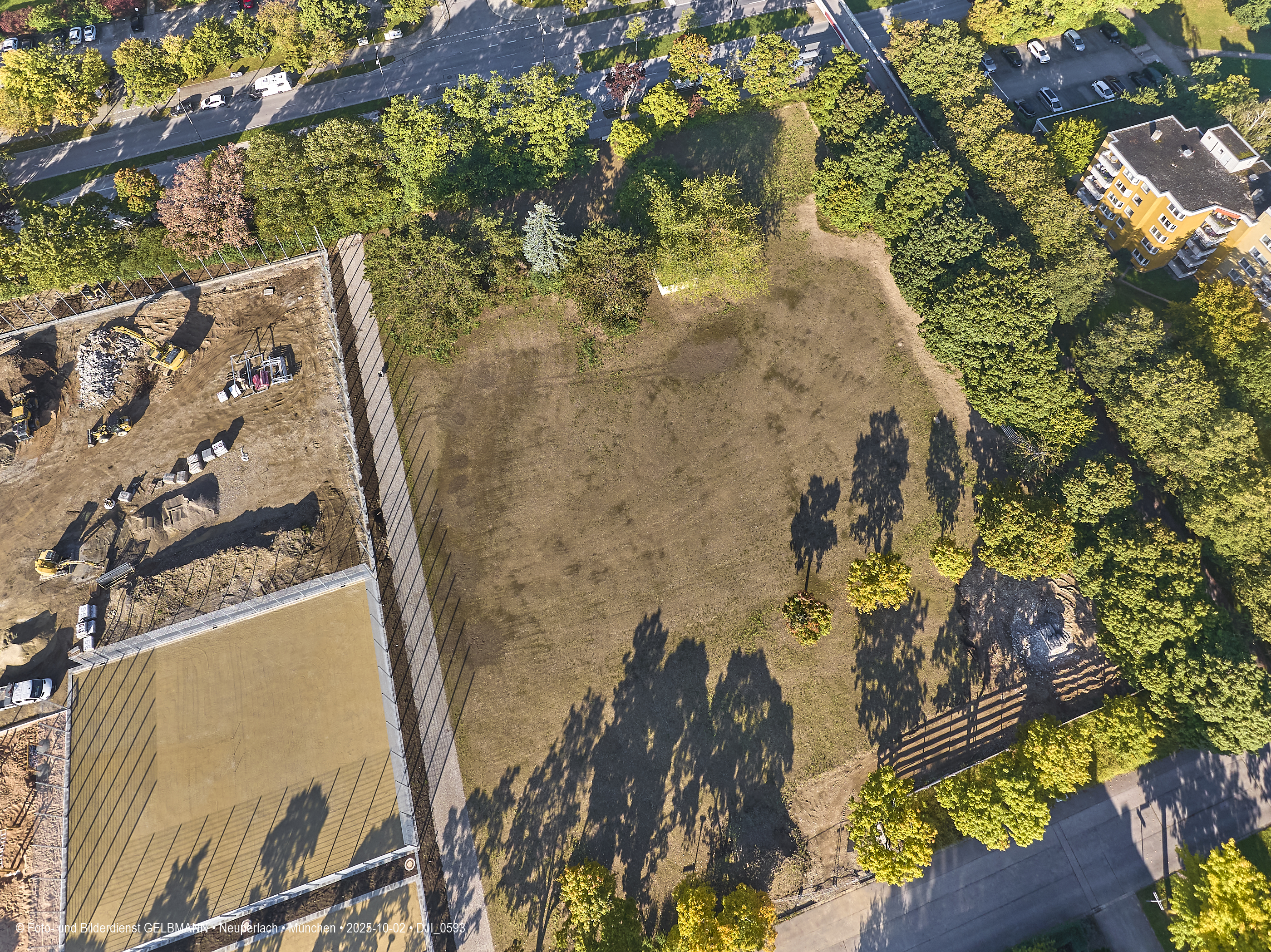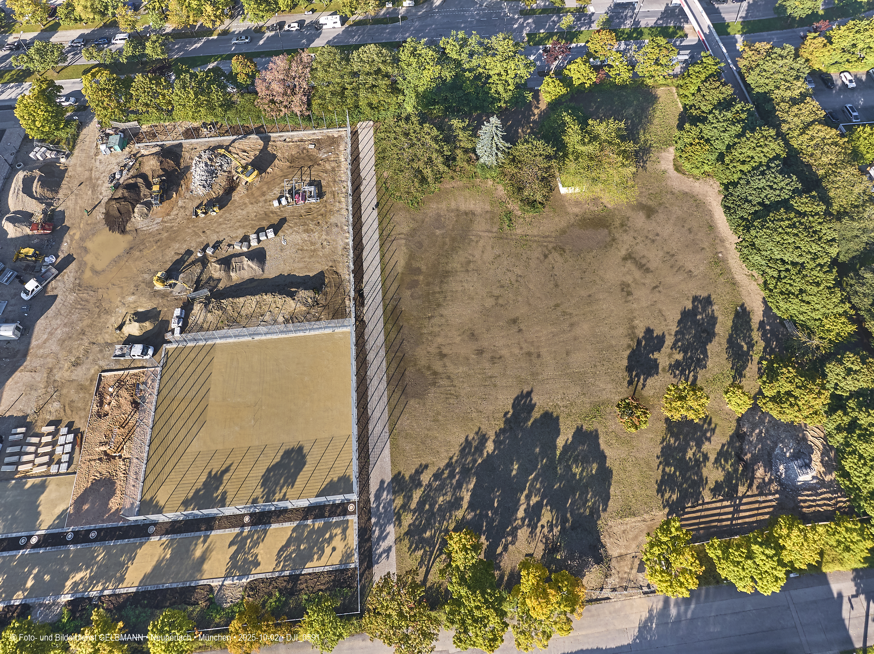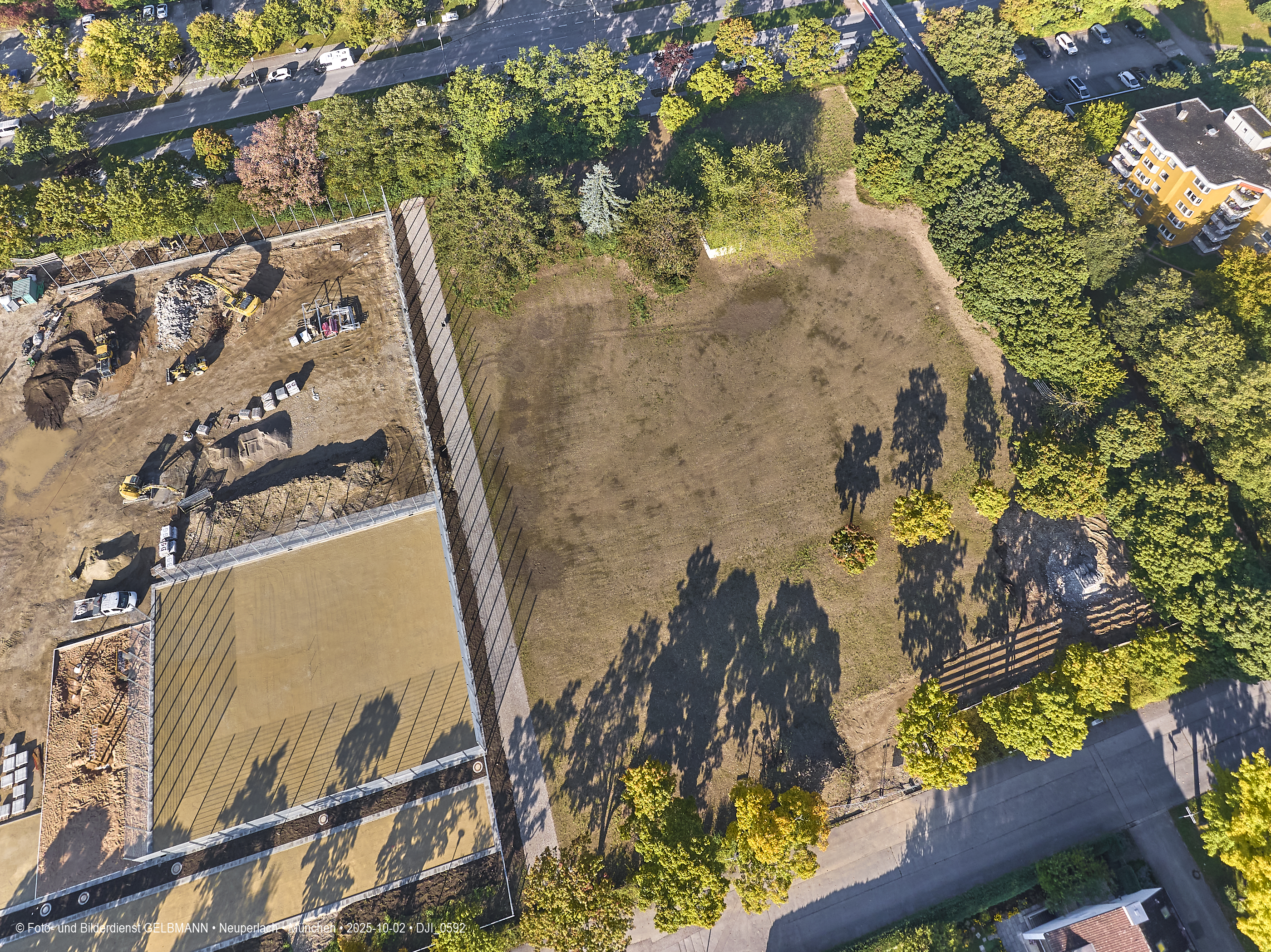 Ein kleiner Teil des neuen Sportplatzes bekommt einen Zaun. Aus der Luft ist dies gut zu sehen. Es sind verschiedene Sport-Areal für diverse Sportarten zu sehen.