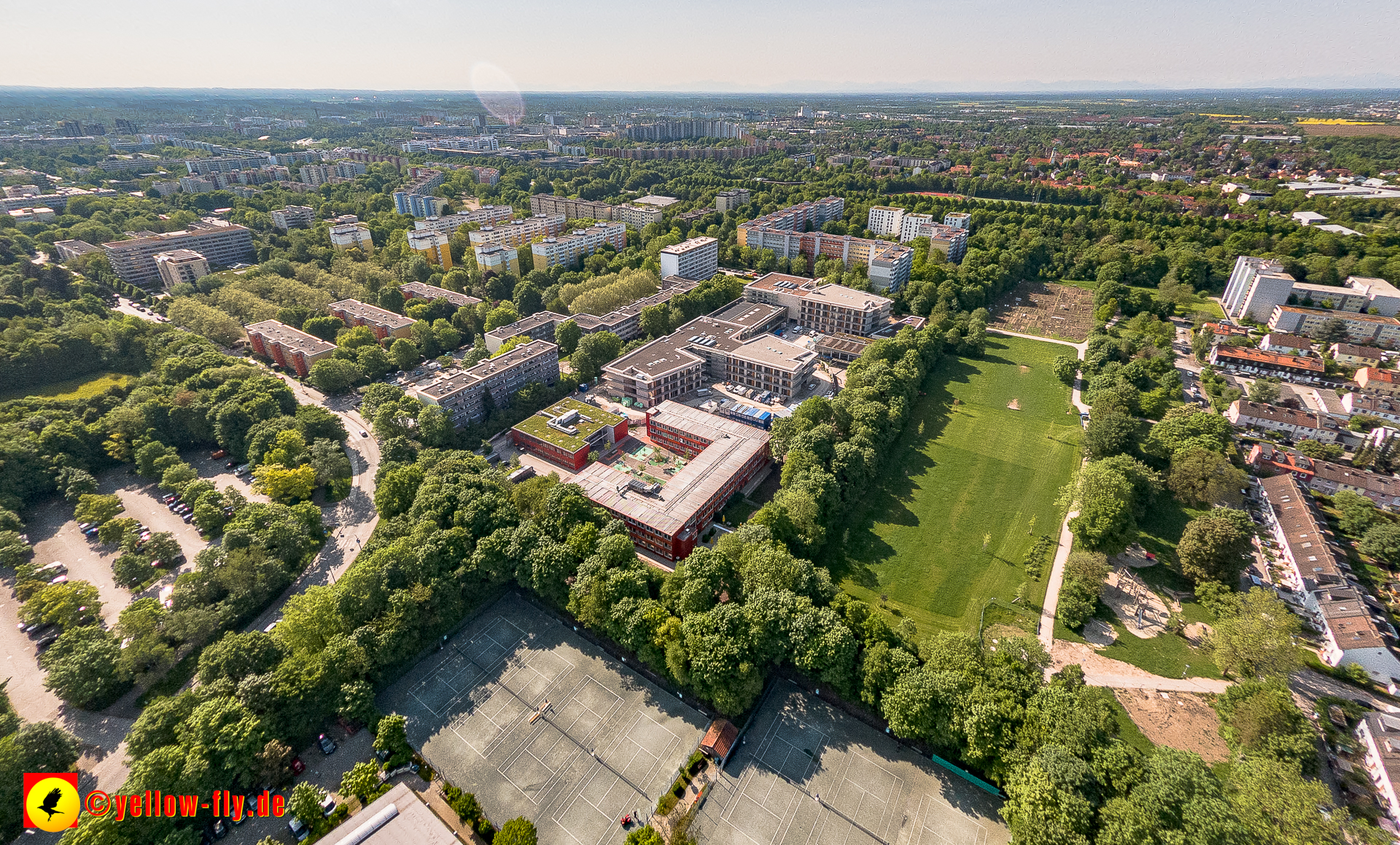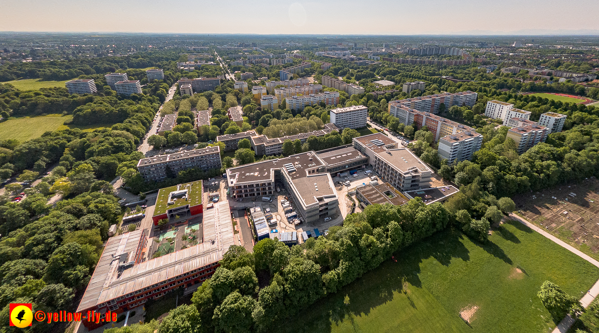 Mein Blick von Oben geht zu unserer neuen Schule am Strehleranger in Neuperlach, Nähe Ostpark. Täglich verändert sich die Optik. Fast fertig könnte man meinen. Auf den Dächern ist noch Baumaterial zu sehen, welches auch bald verschwunden sein wird. Im Hof der Schule stehen noch blaue Baucontainer. Also ganz fertig ist der Neu- un dUmbau noch nicht.